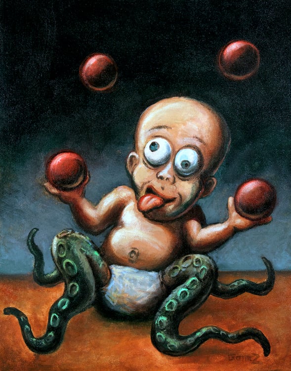 Image of a cute, and talented, tentacle baby juggle red balls. It doesn't matter what you look like, you can have talent and fun. Be yourself!