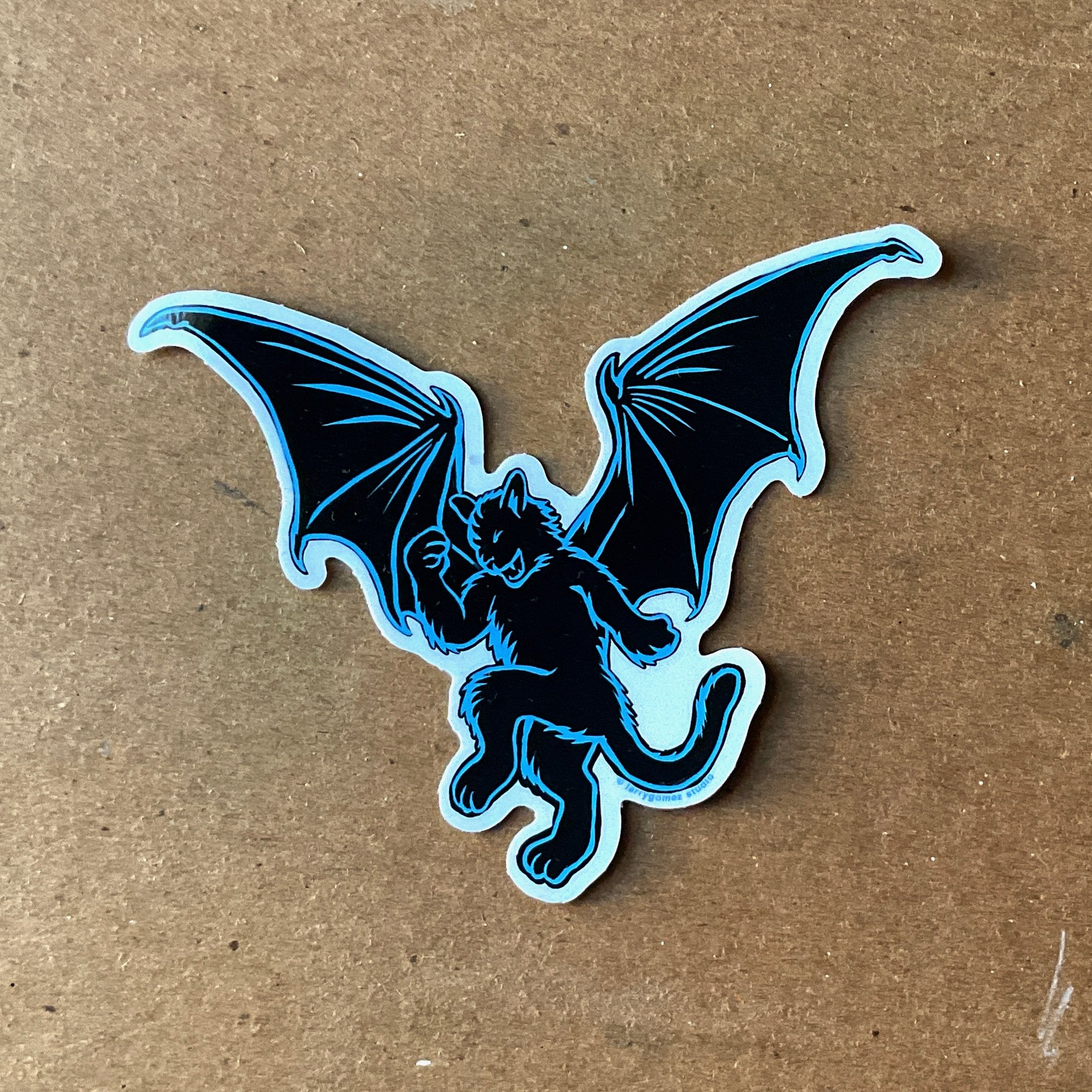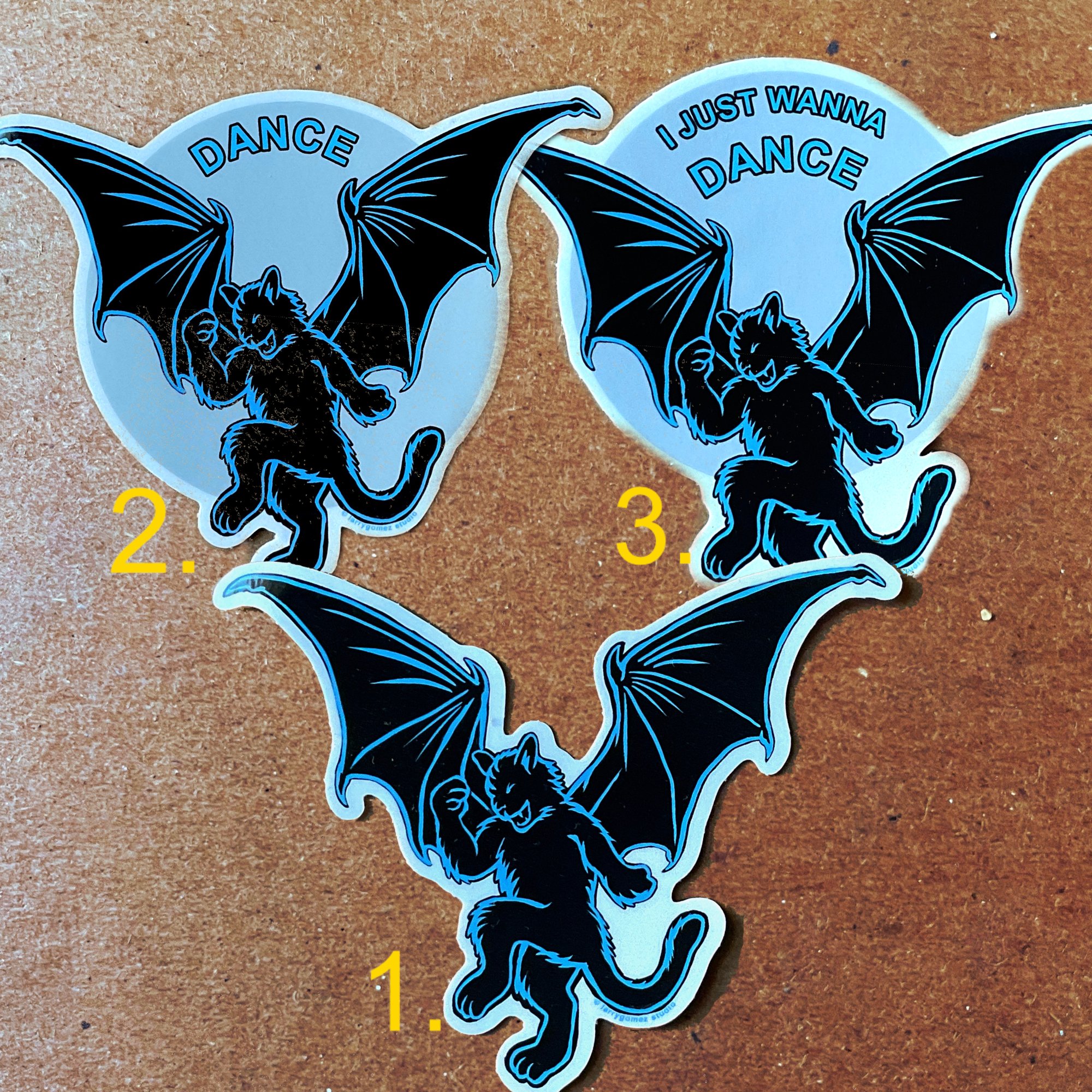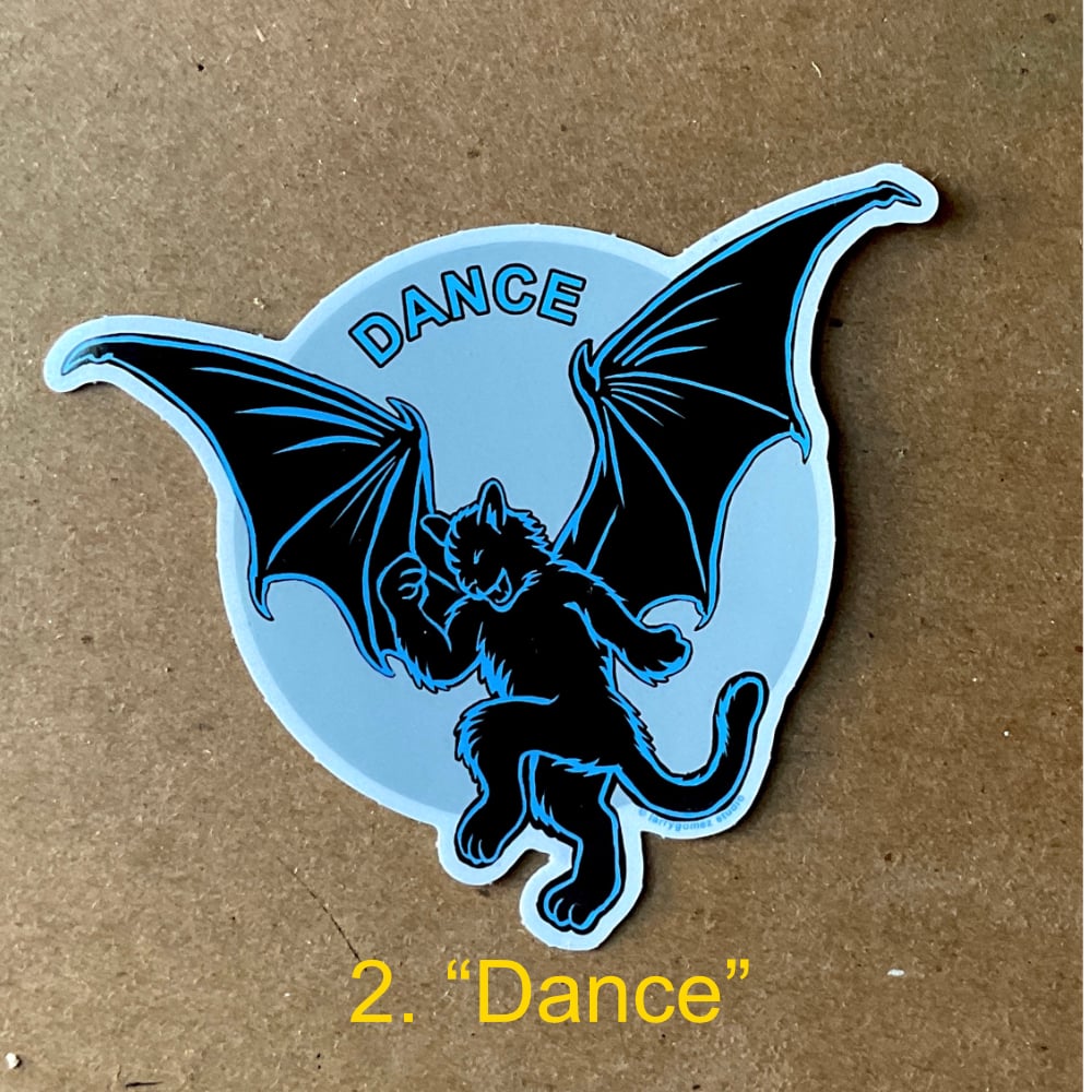 Batcat Dance version 1, 4x3.5 inch vinyl sticker. This Dancing Batcat Sticker series is great for anyone who likes to dance. Dancing Batcat image on vinyl sticker in 3 different styles: