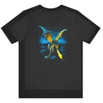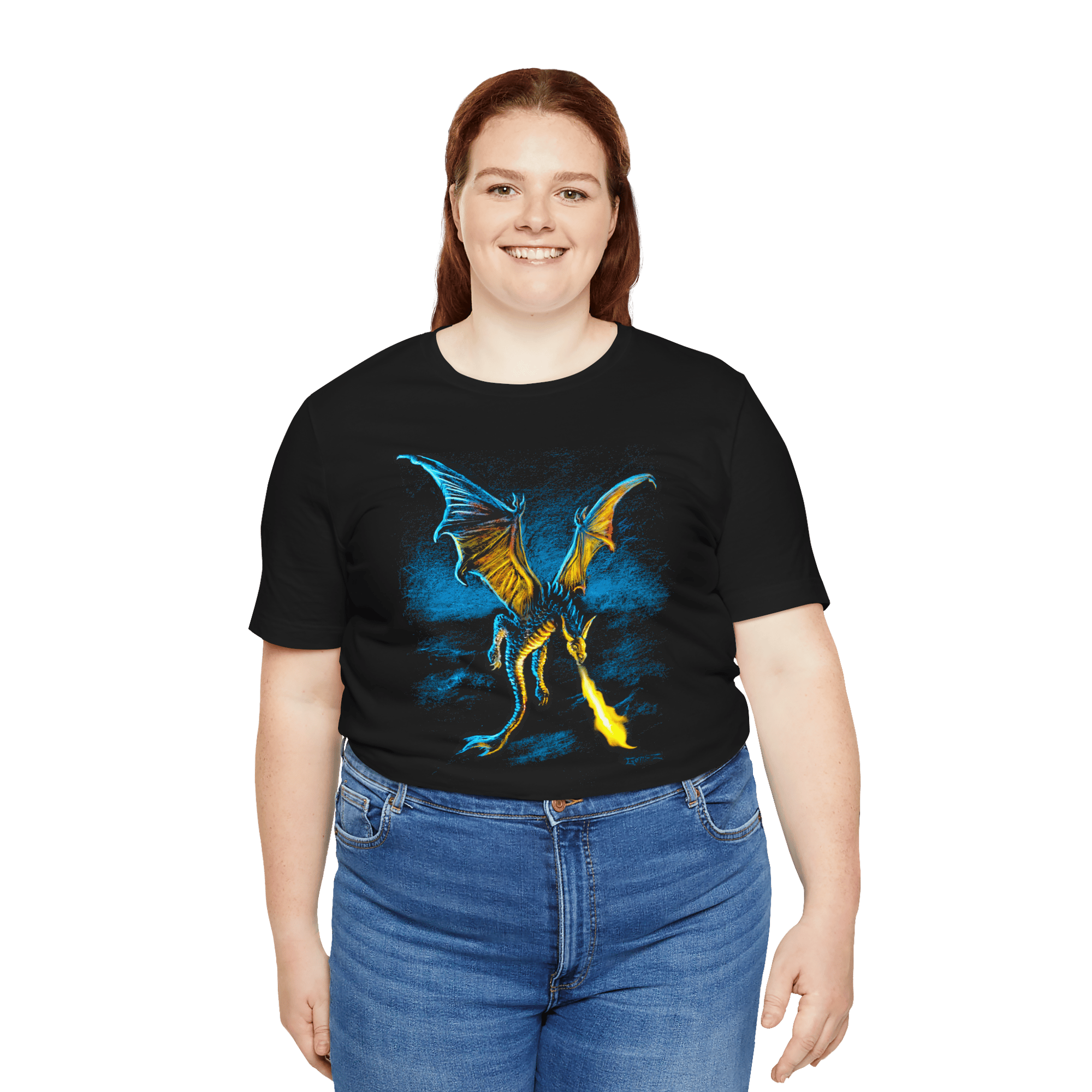 Black T-Shirt of Blue Dragon image with blue background from original drawing.